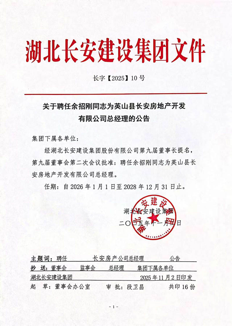 2025年11月2日,经湖北长安建设集团股份有限公司第九届董事长提名,第九届董事会第二次会议批准:聘任徐正新同志为湖北长安建设集团股份有限公司总经理,聘任余招刚同志为英山县长安房地产开发有限公司总经理。上述两项聘任任期一致,均自2026年1月1日起至2028年12月31日止。