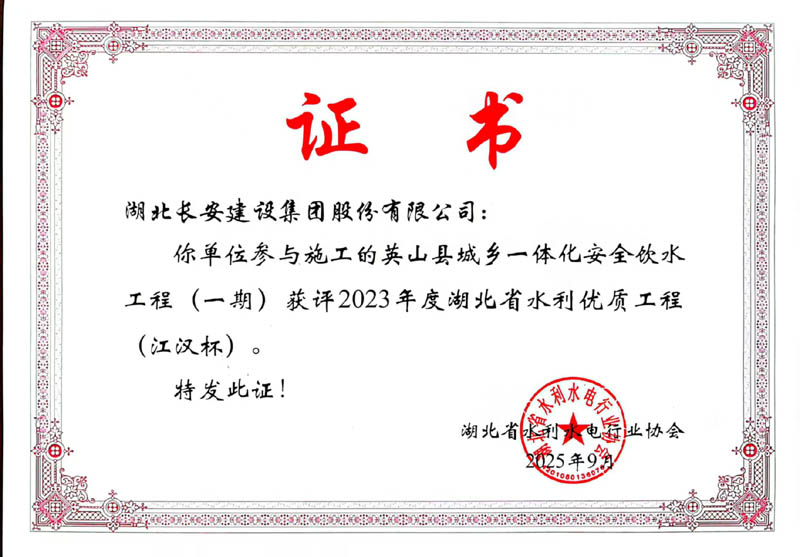 英山县城乡一体化安全饮水工程(一期)获评2023年度湖北省水利优质工程(江汉杯)
