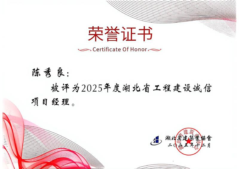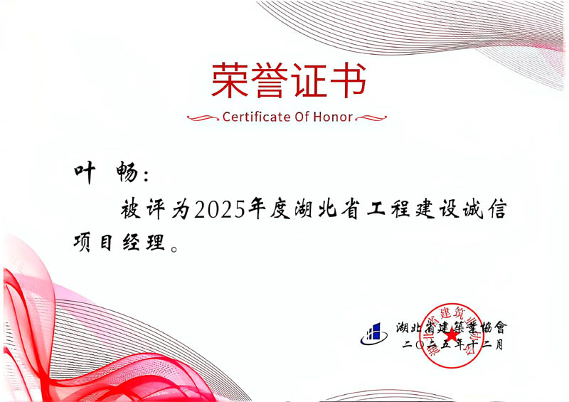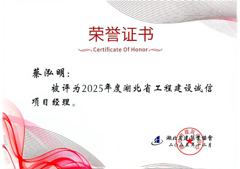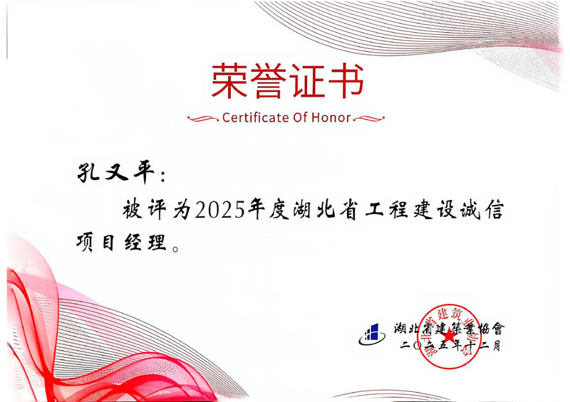 叶畅、蔡泓明、陈秀良、孔又平等4人被评为2025年度湖北省工程建设诚信项目经理