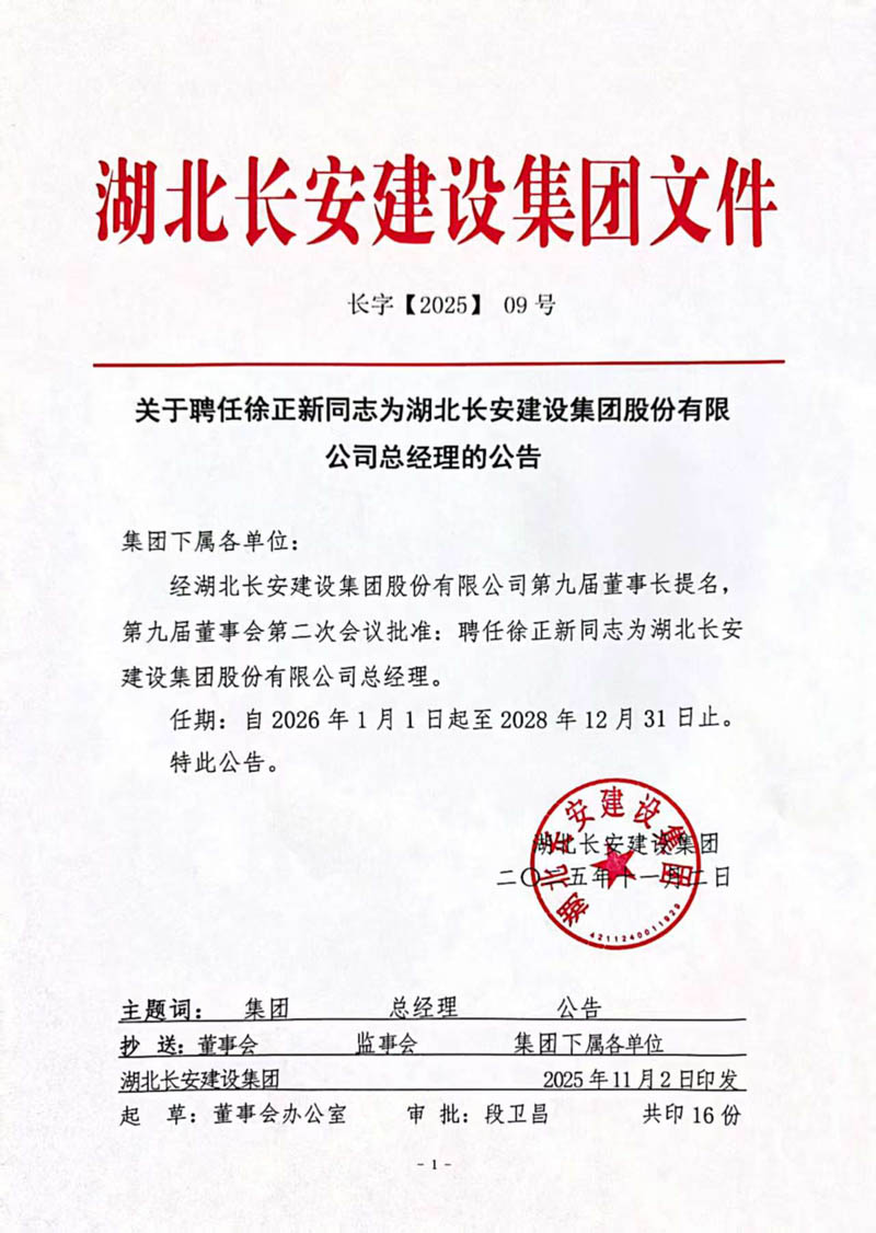 2025年11月2日,经湖北长安建设集团股份有限公司第九届董事长提名,第九届董事会第二次会议批准:聘任徐正新同志为湖北长安建设集团股份有限公司总经理,聘任余招刚同志为英山县长安房地产开发有限公司总经理。上述两项聘任任期一致,均自2026年1月1日起至2028年12月31日止。